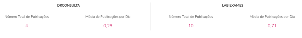 Como vimos na métrica anterior, o Dr.Consulta tem mais seguidores que a Labi Exame. Porém, nesta métrica, vemos que a frequência de posts da Dr.Consulta foi muito baixa em comparação com a Labi Exames no período dos 14 dias analisados.