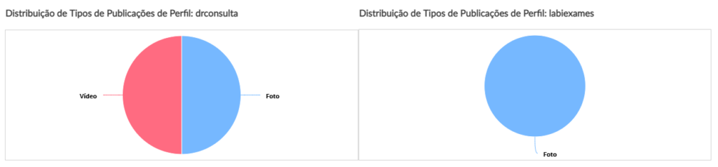 Podemos ver aqui no gráfico que a Dr.Consulta publicou 2 vídeos e 2 imagens e a Labi Exames não variou nos formatos de mídia, publicando apenas fotos.