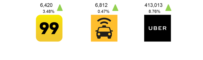 A página do aplicativo Uber possui a maior base de fãs (5.176.685) e foi a que recebeu o maior número de novos fãs durante o período monitorado, seguida pela página do Easy Taxi, que possui a segunda maior base de fãs (1.463.974). Entretanto, a segunda página a ter o maior crescimento proporcional foi a do aplicativo 99Taxis, que possui menos fãs (191.728).