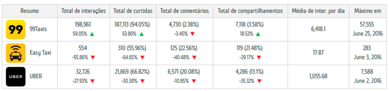 Durante o período monitorado a página do aplicativo 99Taxis foi a única que obteve crescimento no número total de interações, apenas com redução de 3.45% no total de comentários em sua página. Apresentou crescimento de 63% no total de curtidas e 18% no total de compartilhamentos.