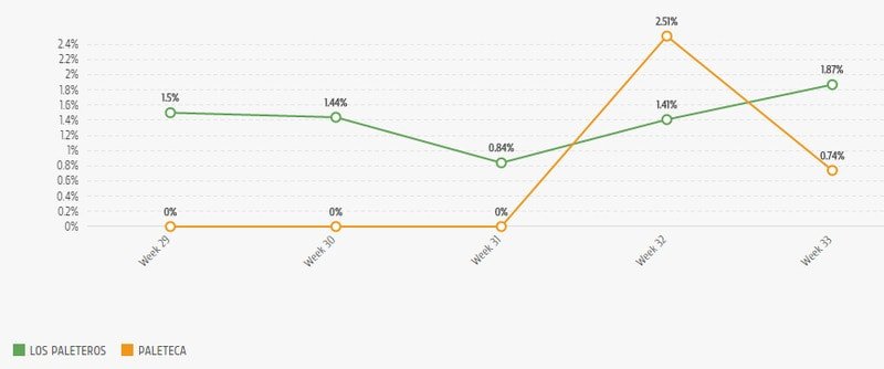 Paleteca é a mais ativa entre as duas páginas, porém seu conteúdo não engaja tanto os fãs. Apenas na semana do Dia dos Pais, a página obteve um aumento de 2,51% no engajamento por post, mas logo em seguida esse número caiu quase 2%. Los Paleteros manteve-se estável durante quase todo o período monitorado e, mesmo com o mural fechado, consegue engajar seu público com poucos posts e conteúdo simples.