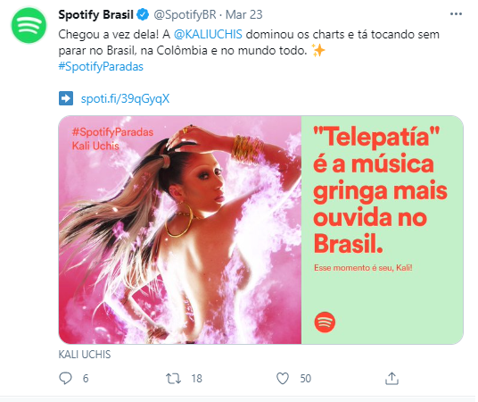 O terceiro post mais engajado é de um ranking feito pelo streaming sobre a música gringa mais ouvida no Brasil.