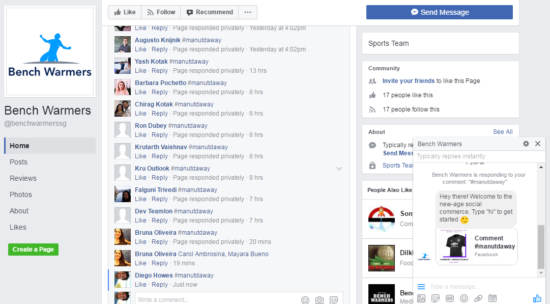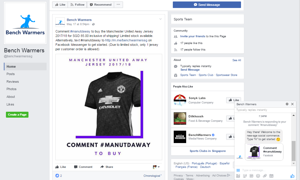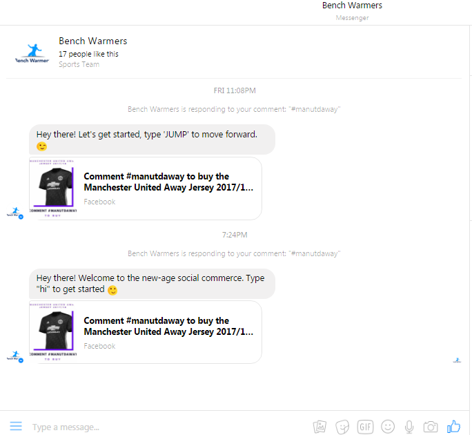 Exemplo do Bot interagindo no Facebook Messenger após comentário com a keyword #manutdaway