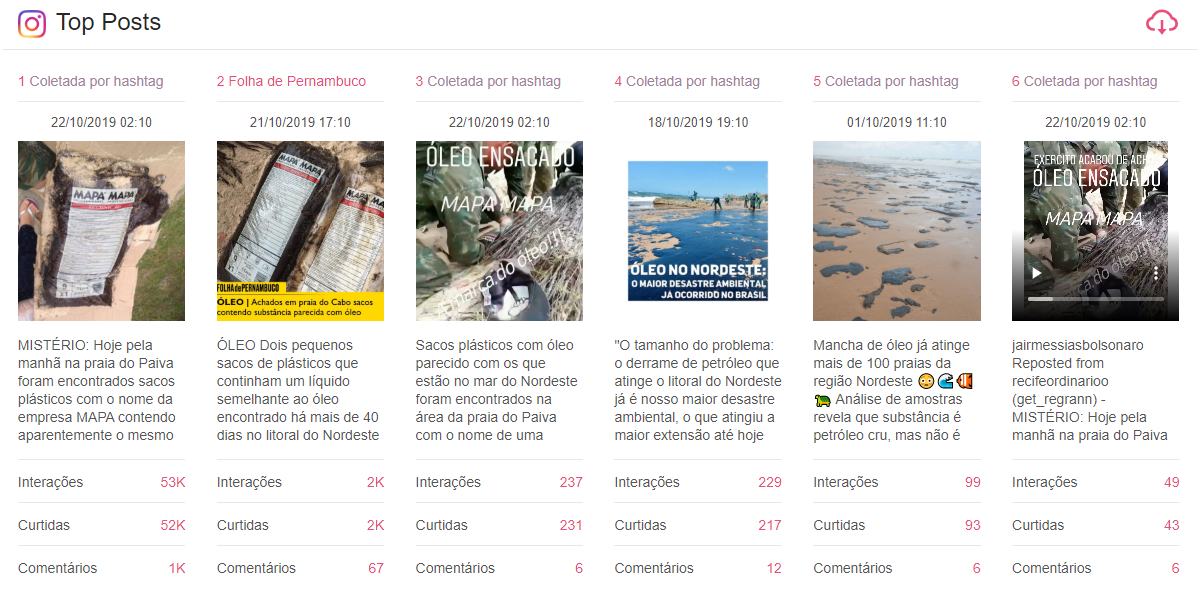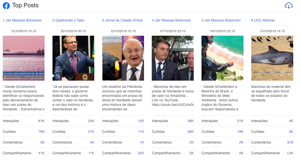Entre os posts que geraram mais engajamento no Facebook, 4 dos 6 principais tratam da investigação feita pela Marinha junto à Petrobras que indicou a Venezuela como possível origem da substância encontrada nas praias nordestinas.