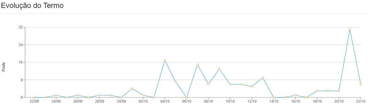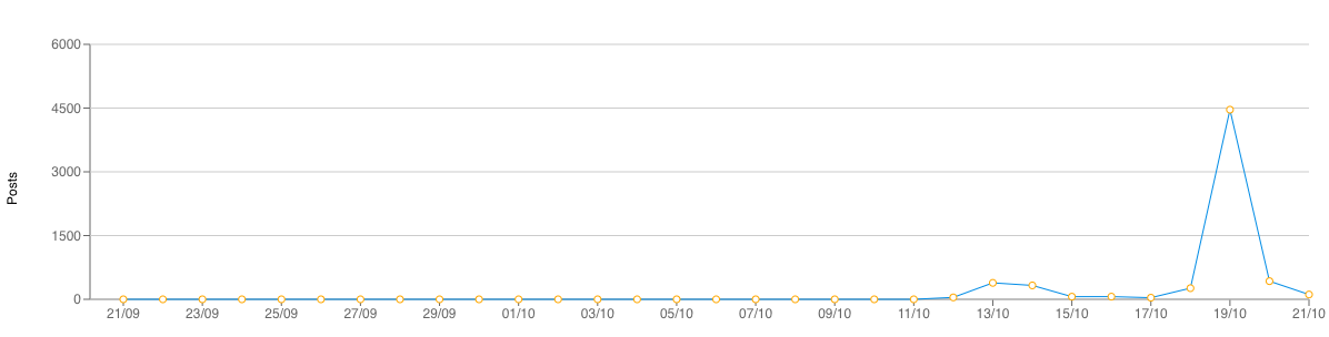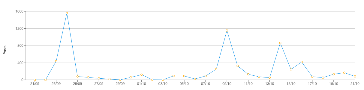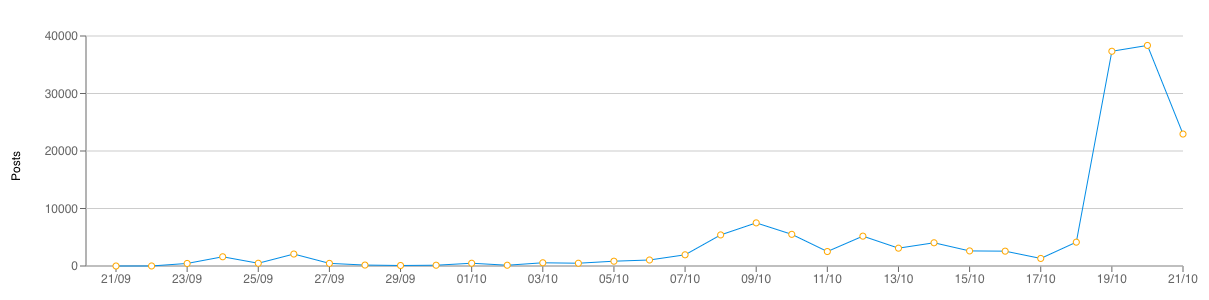 A Petrobras aparece em pequena quantidade de posts sobre o tema. A estatal foi mencionada em apenas 380 publicações, 0,38% do total entre os dias 19 e 20 de outubro (98.801 posts). Veja a evolução dos posts com os termos “óleo”, “nordeste” e “petrobras” entre os dias 21 de setembro e 21 de outubro: