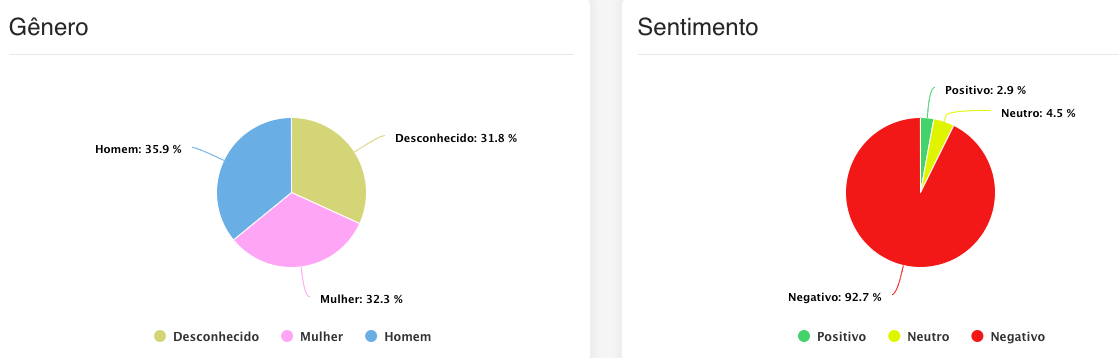 A grande maioria dos posts sobre o desastre ambiental tiveram sentimento negativo (92,7%). Além disso, a divisão por gênero ficou equilibrada, com 32,3% dos posts feitos por mulheres e 35,9% feitos por homens: