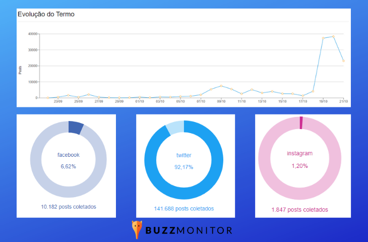 O pico de menções sobre o desastre ambiental aconteceu no final de semana. Foram 98.801 posts nas redes sociais entre os dias 19 e 21 de outubro, segundo dados do Buzzmonitor Trends.
