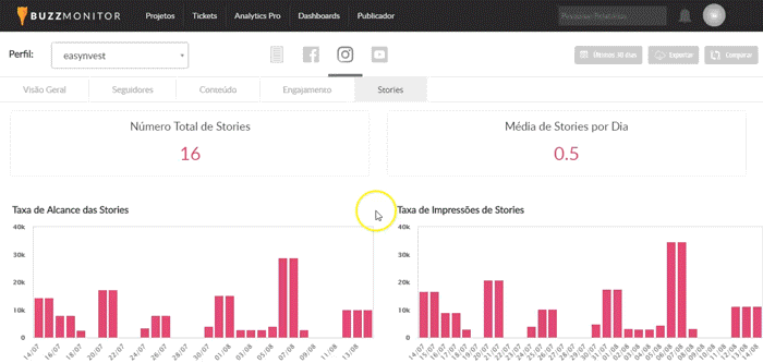 Os dados de Instagram Stories de perfis do Instagram associados ao Buzzmonitor passam a ser exibidos no Analytics Pro. Essas novas informações podem ser visualizadas na aba Stories, logo após um perfil ser selecionado.