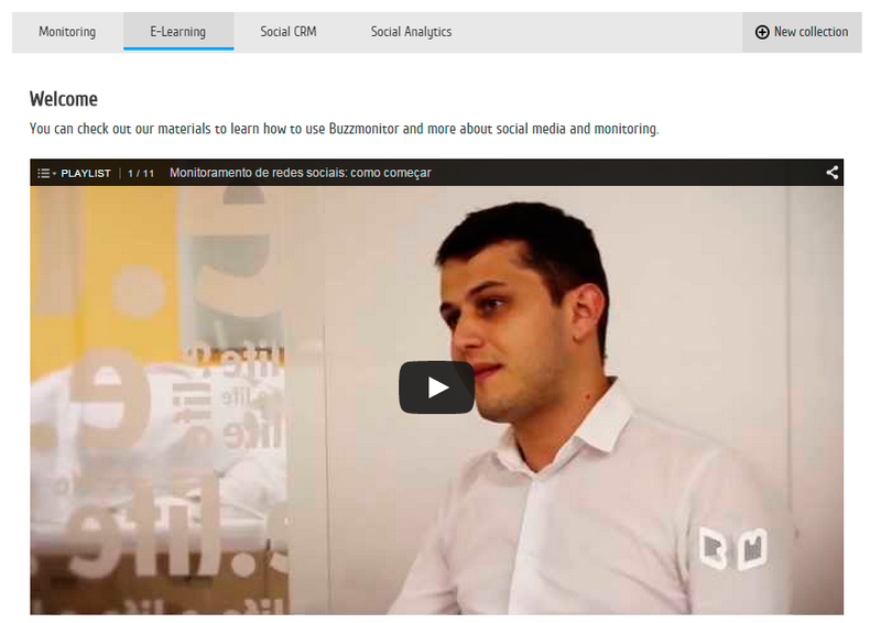 Na página de boas-vindas, o usuário pode aprender a usar o Buzzmonitor com e-books, apresentações e vídeos diversos.