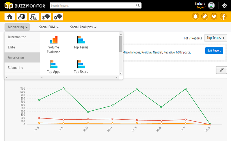 Para facilitar a navegação entre um relatório e outro, foi criado um menu que permite que relatórios sejam encontrados mais facilmente sem que o usuário tenha que ir para a página de início do Buzzmonitor.