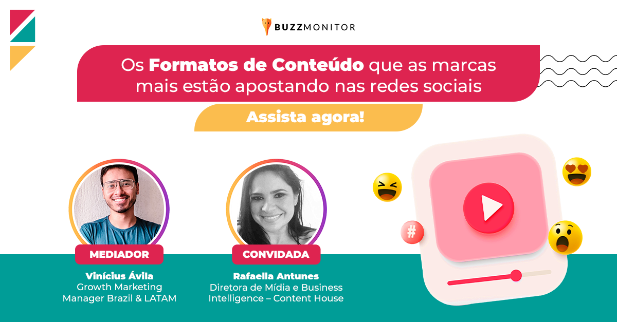 Nesta quinta-feira (8), a Buzzmonitor realizou o Webinar Formatos de Conteúdo, no YouTube. O seminário online abordou os formatos de conteúdos mais utilizados por empresas nas redes sociais e expôs aprendizados do estudo da Buzzmonitor, que analisou 6,1 bilhões de publicações feitas por perfis corporativos nos últimos dois anos a partir da plataforma.