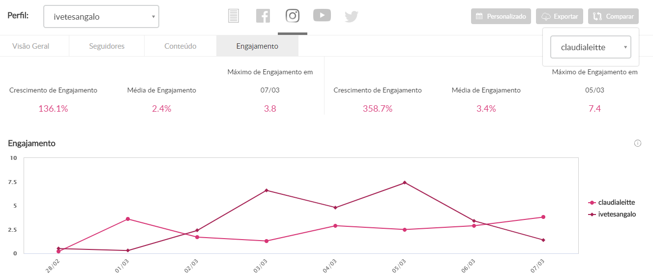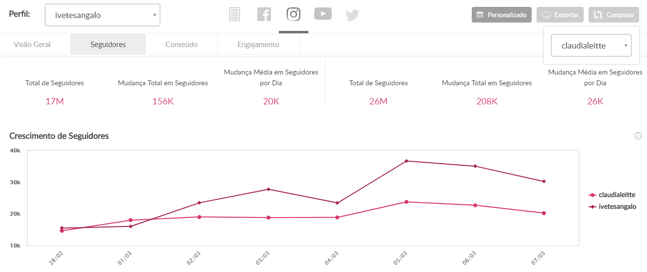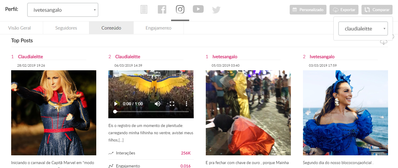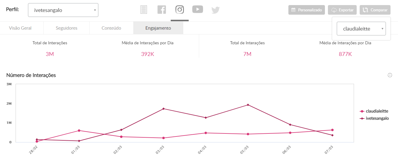 Entre os dias 28 de fevereiro e 7 de março, monitoramos os perfis no Instagram das cantoras Ivete Sangalo (@ivetesangalo) e Claudia Leitte (@claudialeitte) por meio do Analytics Pro do Buzzmonitor.