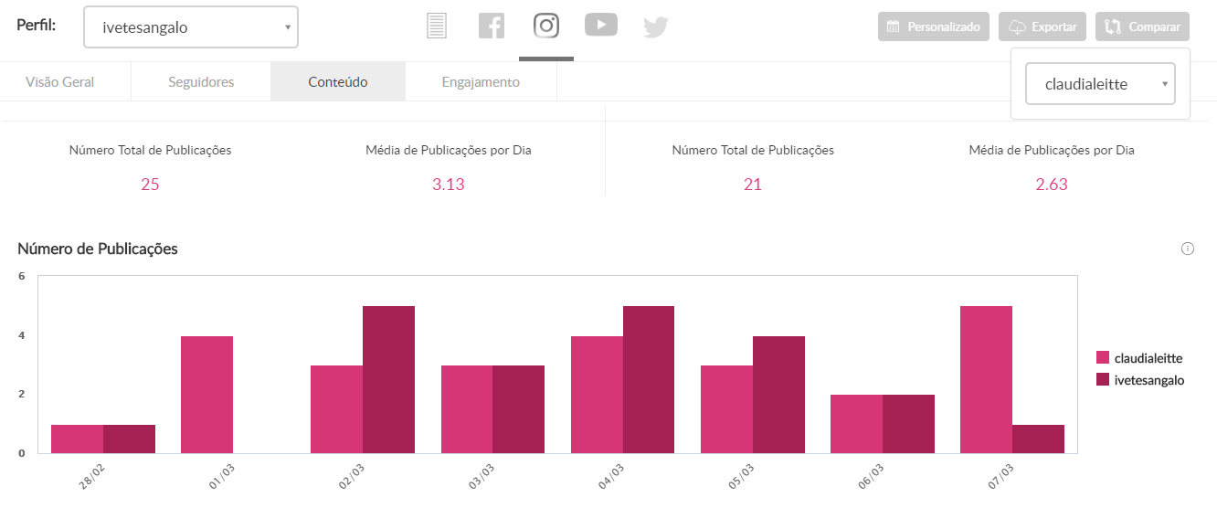 Entre 28 de fevereiro e 7 de março, Claudia Leitte publicou 25 vezes, fazendo uma média de 3.1 posts por dia. Já Ivete Sangalo fez 21 publicações, totalizando uma média de 2.6 posts por dia. Os números são próximos e mostra como ambas são ativas na rede social.