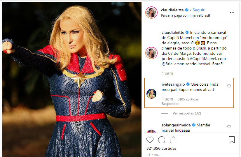 Já a principal publicação de Claudia Leitte foi um post patrocinado pela Marvel Brasil feito no dia 28 de fevereiro. A imagem mostra a cantora fantasiada de Capitã Marvel divulgando o novo filme da franquia. Foram mais de 321K curtidas e mais de 5K comentários. Destaque para o comentário de Ivete Sangalo: