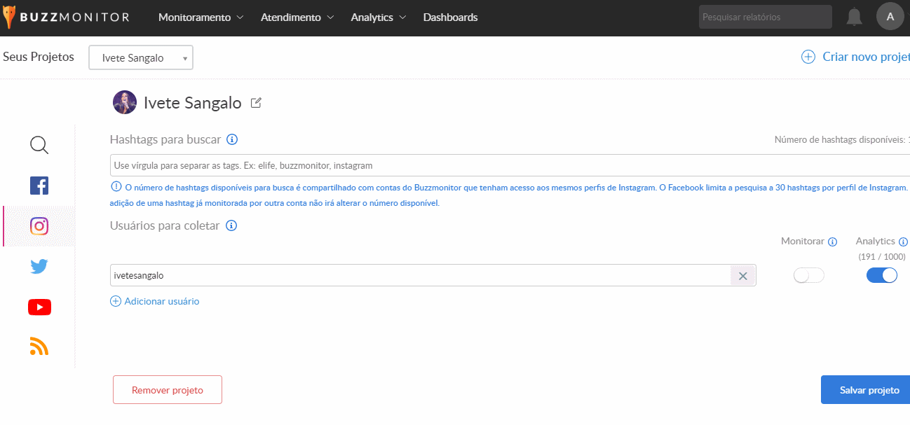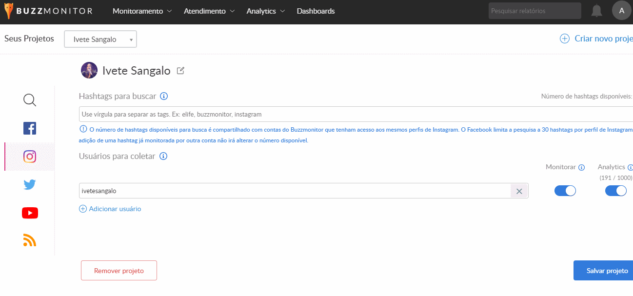 Com o Buzzmonitor é possível monitorar perfis públicos e comerciais de Instagram, como é o caso das cantoras Ivete Sangalo (@ivetesangalo) e Claudia Leitte (@claudialeitte). Os dados ficam disponíveis no módulo Analytics.