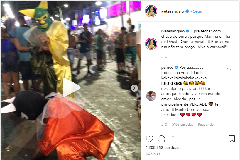 O vídeo mostrando Ivete Sangalo disfarçada se divertindo no carnaval de rua teve mais de 1 milhão de curtidas e mais de 34K comentários. O post orgânico foi feito dia 5 de março:
