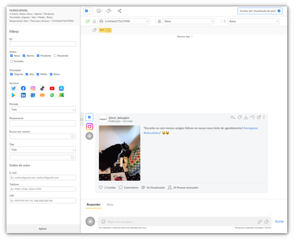 Implementamos novos filtros na tela de tickets para proporcionar um maior controle e personalização. Agora, também será possível filtrar os tickets por período, serviço, tags e dados do autor (e-mail, telefone e CPF).