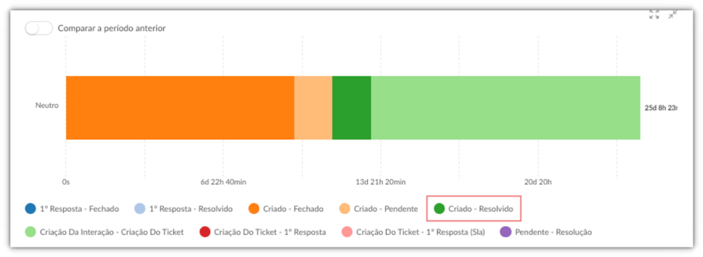 O ciclo de vida dos tickets estão ainda mais detalhados nos gráficos, divididos por intervalos de ticket. Agora, será exibido também o intervalo Criado – Resolvido, que representa o período entre a criação da interação até a alteração do status para resolvido.