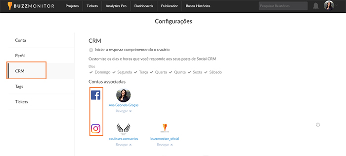 Depois é só sincronizar o Facebook ao Buzzmonitor. Vá até Configurações, selecione a aba CRM e sincronize o Facebook. Como sua conta de Instagram estará vinculada ao Facebook, automaticamente ela aparecerá sincronizada à ferramenta.