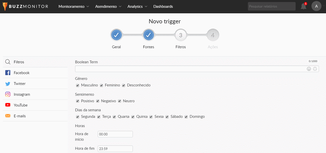 2. Em Filtros, escreva todos os termos booleanos sensíveis que possam gerar uma crise para sua marca. Por exemplo: