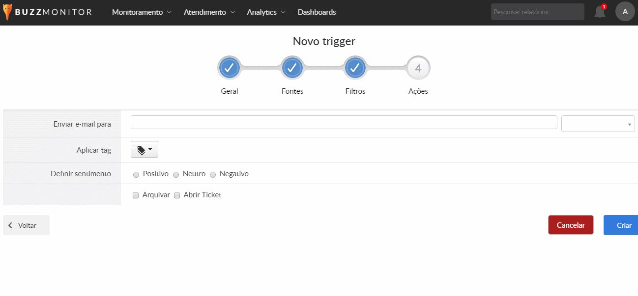 3. Em Ações, escreva o e-mails que deverão receber os alertas, a periodicidade e as ações que devem ser feitas (aplicar tag, definir sentimento, arquivar ou abrir um ticket para o caso). Depois clique em Criar.