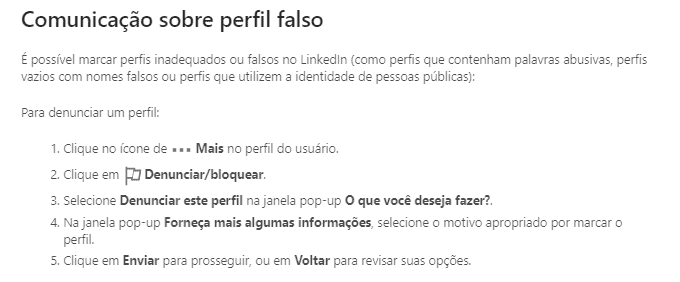 O LinkedIn não dispõe de um formulário para denunciar perfis falsos ou inadequados, mas há um passo a passo fornecido pela rede para denunciar tais perfis, veja abaixo ou clique aqui.