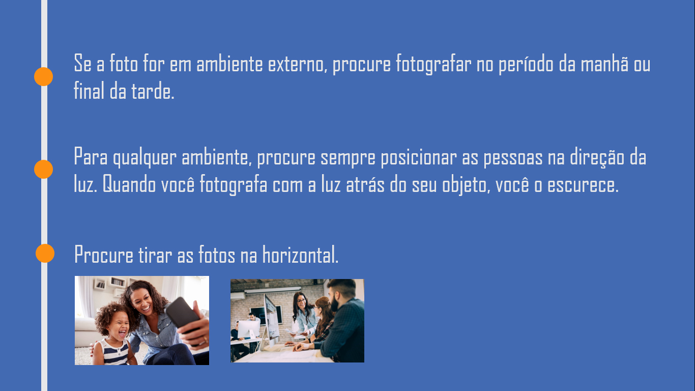 A iluminação é o fator mais importante para uma boa fotografia. Por isso, procure um local bem iluminado, de preferência com luz natural (ex: paredes próximas às janelas).