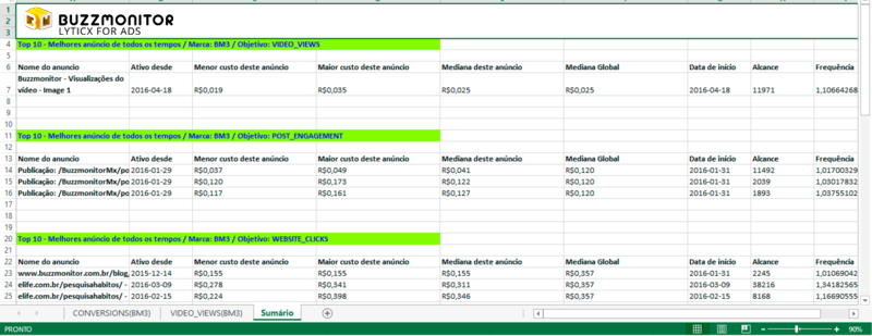 Além do relatório diário por e-mail, o Buzzmonitor Lyticx for Ads disponibiliza uma planilha consolidada com diversas outras informações. Entre elas está o Top 10 Melhores Anúncios de Todos os Tempos. Esta lista se divide por objetivo, ou seja, você visualiza os anúncios que tiveram mais conversões, os anúncios que tiveram mais cliques, os anúncios que tiveram mais visualizações e assim por diante. A planilha segue anexada no próprio e-mail do Lyticx.