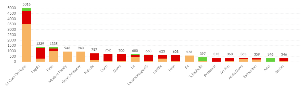 De 03/12 a 05/12, 32.532 mil publicações foram feitas no Twitter com os termos “La Casa de Papel” ou “#LCDP5”. Esses tweets foram gerados por 24.916 usuários distintos.