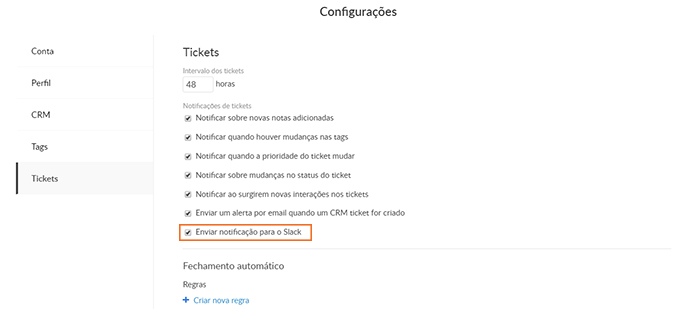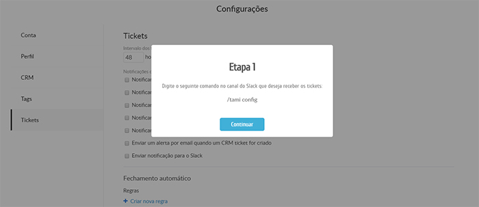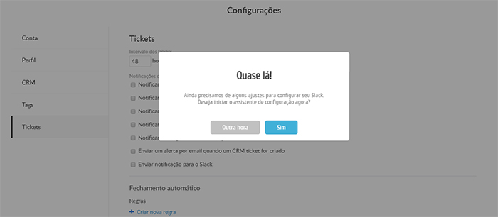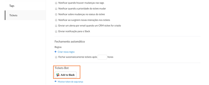 1. Vá até Configurações, clique na aba Tickets e selecione o botão Add to Slack.