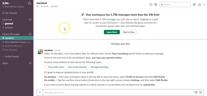 5. Abra o Slack, crie um novo canal e digite o comando dentro do canal.