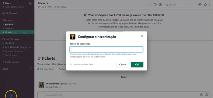 6. Aparecerá uma mensagem solicitando que você insira um token de segurança. Volte ao Buzzmonitor, clique em Continuar e então copie o token que aparecerá na tela e cole-o no Slack.