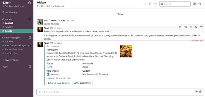 Com o crescimento do módulo de Atendimento ao Consumidor do Buzzmonitor, o trabalho em grupo em grandes times para gestão de tickets de atendimento se tornou uma necessidade. E então surgiu a ideia: por que não integrar o Buzzmonitor com o Slack, aproveitando o melhor das duas plataformas? E foi isso que ocorreu. Slack e Buzzmonitor agora funcionam integrados e você terá o melhor dos dois mundos.
