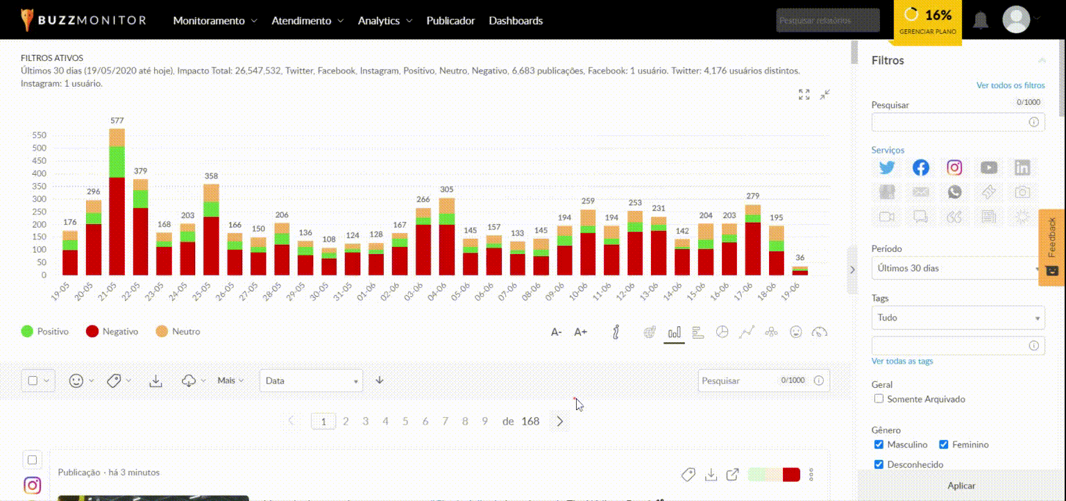 Todos os dados dos posts estarão disponíveis no Monitoramento e no Analytics Pro do Buzzmonitor e você poderá acompanhar as publicações feitas pelo influenciador no Instagram.