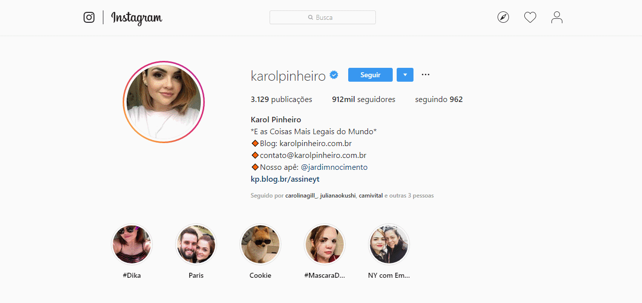 - Perfis públicos e comerciais, como o da Karol Pinheiro, influenciadora digital com mais de 1 milhão seguidores apenas no Instagram;