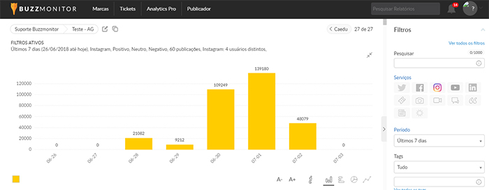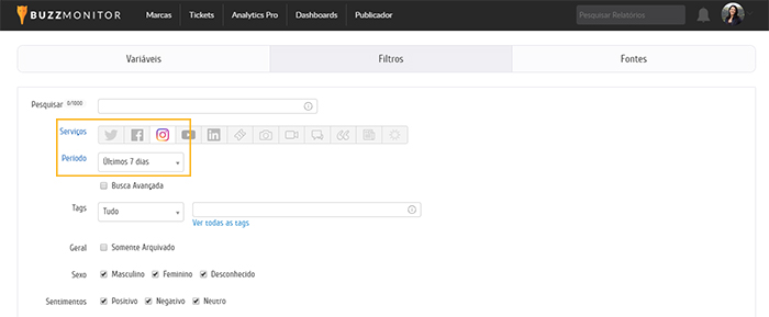 1. Crie um novo relatório e selecione a opção Ver todos os filtros. Na aba Filtros, deixe ativado apenas o serviço Instagram e selecione o período que você deseja monitorar.