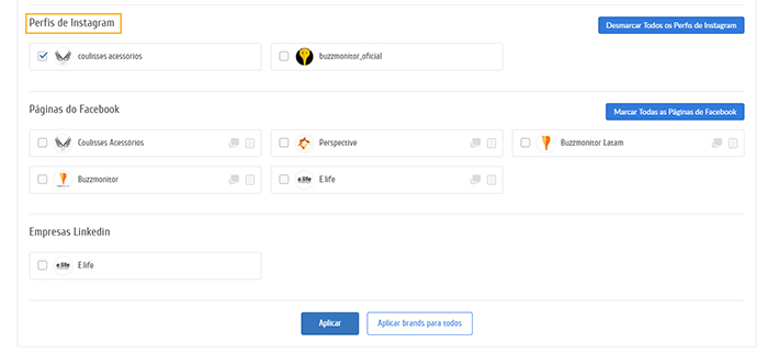 3. Agora vá na aba Fontes. Role a página até encontrar a opção Perfis de Instagram e selecione o perfil (ou os perfis) que você deseja monitorar os Stories. Clique em Aplicar.