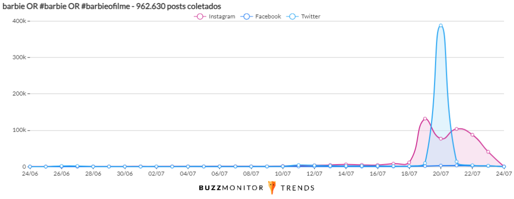 Apenas no dia 20/07, foram publicados mais de 460 mil posts com os termos “barbie, #barbie ou #barbieofilme nas redes sociais de noticiosos e influenciadores (em português). Se contabilizarmos os posts de 24/06 a 24/07, são mais de 960 mil. É o que revelam os dados da plataforma de monitoramento e atendimento multicanal, a Buzzmonitor.