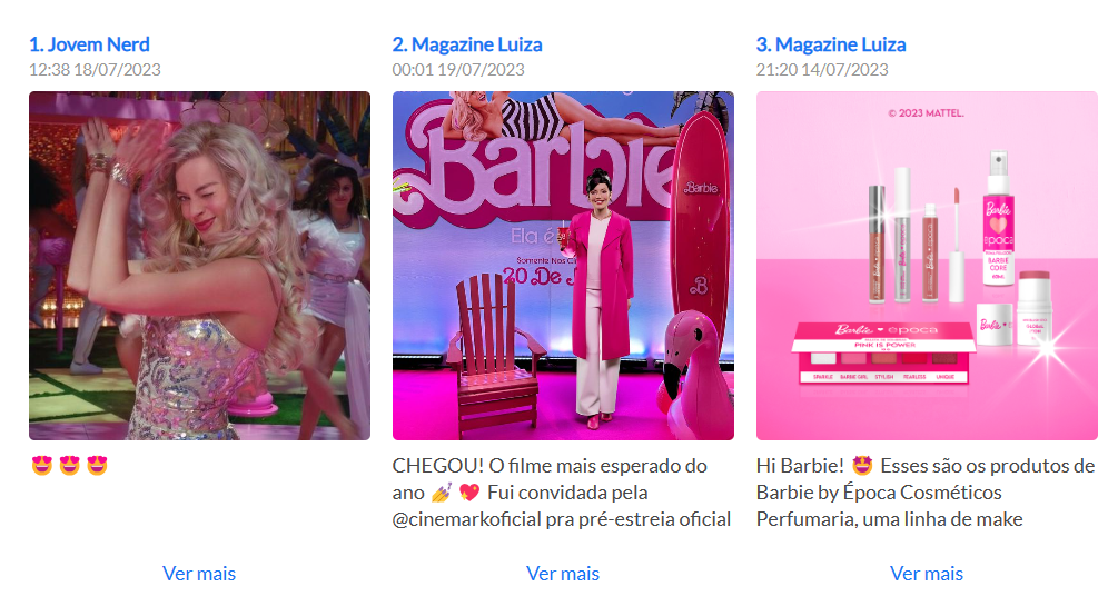 No Facebook, os primeiros lugares do ranking das menções à Barbie ficaram com a notícia do Jovem Nerd anunciando que o filme bateu recorde pré-venda da Warner (82.1 mil interações), Parceria da Magazine Luiza com o Cinemark, falando da presença da Lu na pré-estreia (78.9 mil posts) e Magazine Luiza divulgando a linha especial da Época Cosméticos edição Barbie (51.5 mil interações).