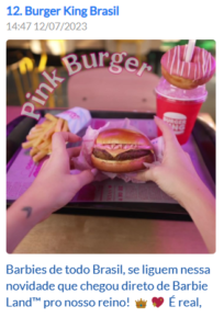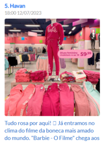 Outra marcas que também aparecem na lista de top posts são: Havan e sua seleção de roupas rosas (39.9 mil interações), Burguer King com seu lanche temático (11.6 mil interações), Melissa citando sandálias da Barbie (8.1 mil interações) e Boulevard Shopping Belém lembrando sobre a data da estreia (6.6 mil interações).