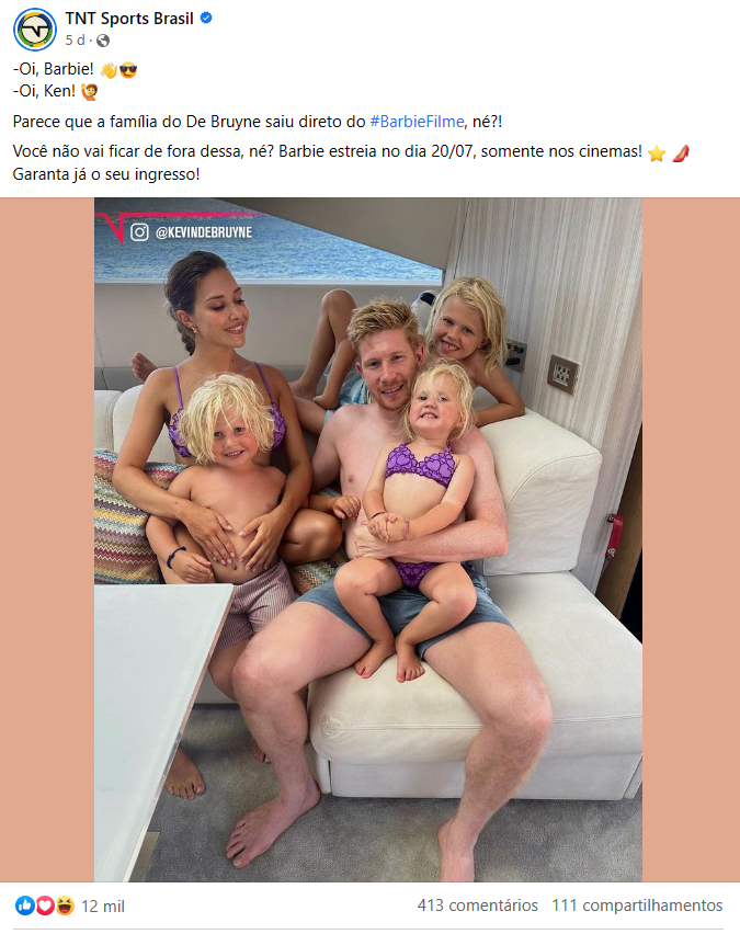 O fato do post do TNT Sports aparecer como o destaque de engajamento entre os veículos, mostra o impacto do filme para além do território da moda e do entretenimento. O veículo fez um gancho com o tema associando a família do jogador do Manchester City, Kevin de Bruyne, à família da Barbie.