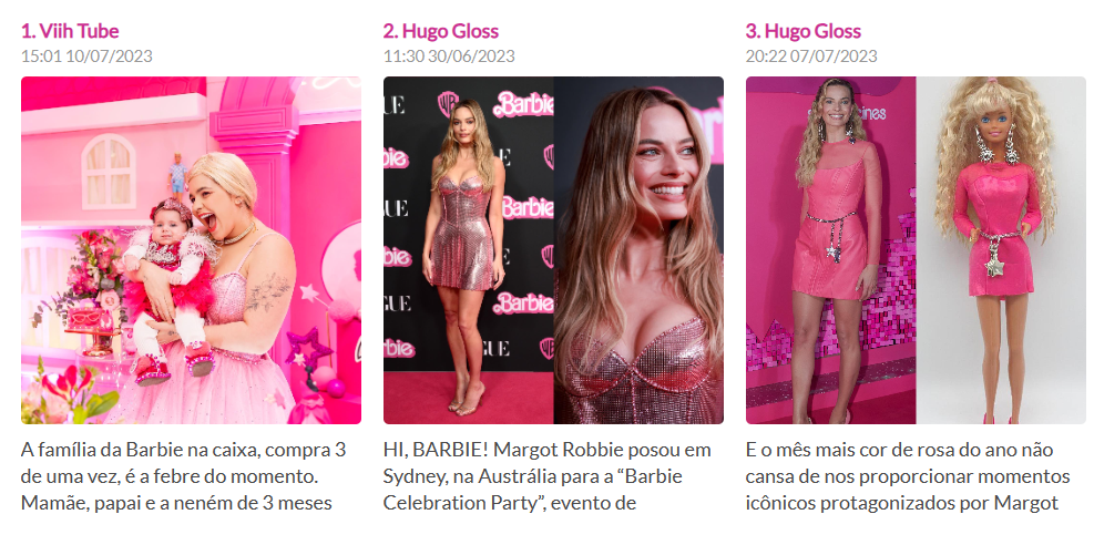 Dentre os veículos que abordaram o filme da Barbie em sua pautas: TNT Sports Brasil, Band Jornalismo, Fatos Desconhecidos, Hugo Gloss, Portal na Telinha, TNT Brasil, Caras Brasil, Portal R7, Revista Istoé, Revista Pais & Filhos e Contigo!. As matérias do Portal na Telinha, Revista Istoé, Revista Pais & Filhos e Contigo! mencionaram o mesversário da filha de Viih Tube, Lua, com o tema Barbie.