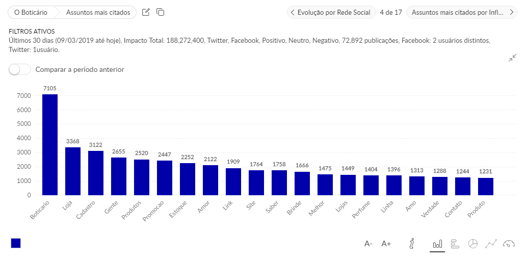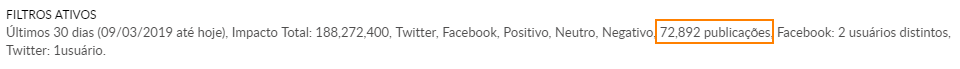 Os termos são coletados a partir da base de dados presente no período selecionado. No exemplo acima, foram analisadas 72.892 publicações e os 20 principais termos aparecem no gráfico.
