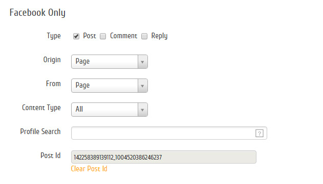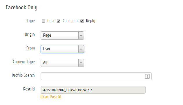 Em Facebook Only, selecione Comment e Reply; Origin: Page; From: Users e finalize clicando em Apply.