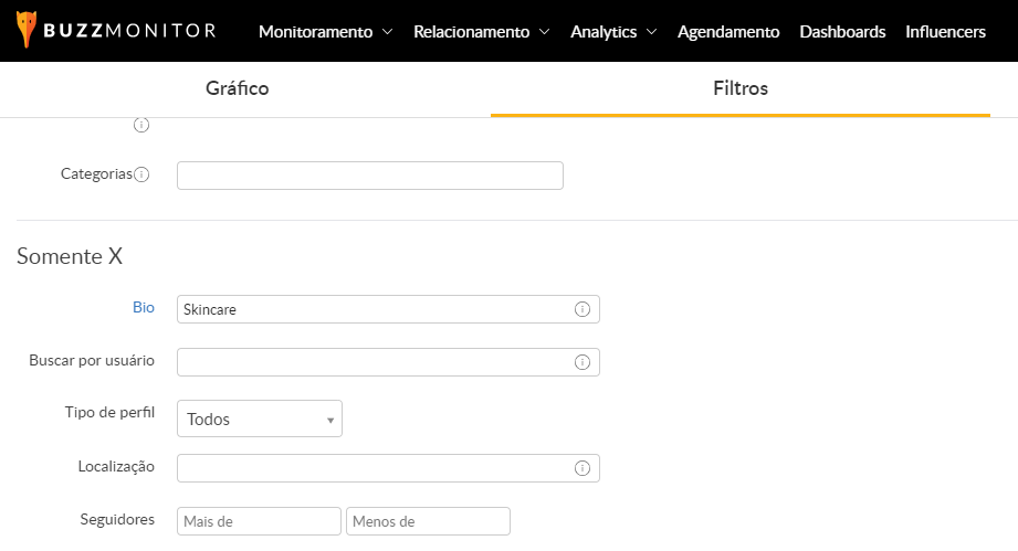Dessa forma, o social listening da Buzzmonitor irá filtrar os influenciadores que falam de cosméticos e que tenham o termo skincare na sua biografia, a descrição do seu perfil.