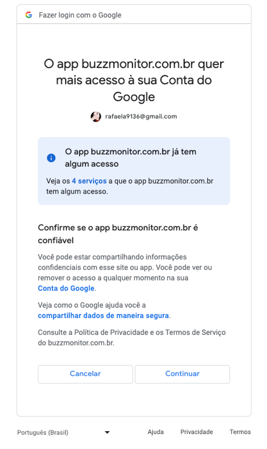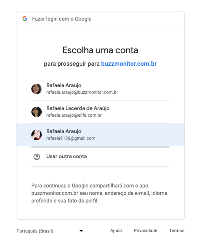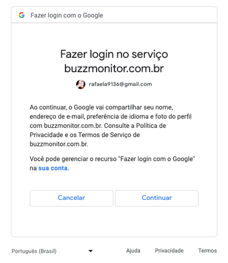 Passo 4: Durante o login do Google, serão exibidas duas telas solicitando permissões para que a Buzzmonitor possa acessar os dados dos aplicativos. Aceite essas etapas para concluir a associação com sucesso.