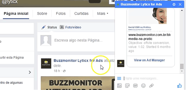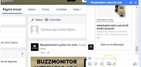 Entre na página do Buzzmonitor Lyticx for Ads no Facebook e envie uma mensagem via inbox para iniciar a conversa com o chatbot.