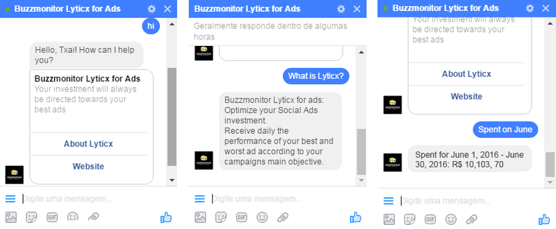 O Buzzmonitor Lyticx for Ads está cada vez mais conectado ao mundo do social media: criamos um chatbot com as informações mais relevantes sobre os seus investimentos nas redes sociais.Por exemplo: