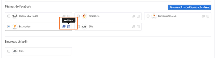 3. Lembre-se de em Fontes deixar sua página selecionada em Marcas e também em Páginas do Facebook (a opção Wall Posts deve estar ativa). Clique em Aplicar.
