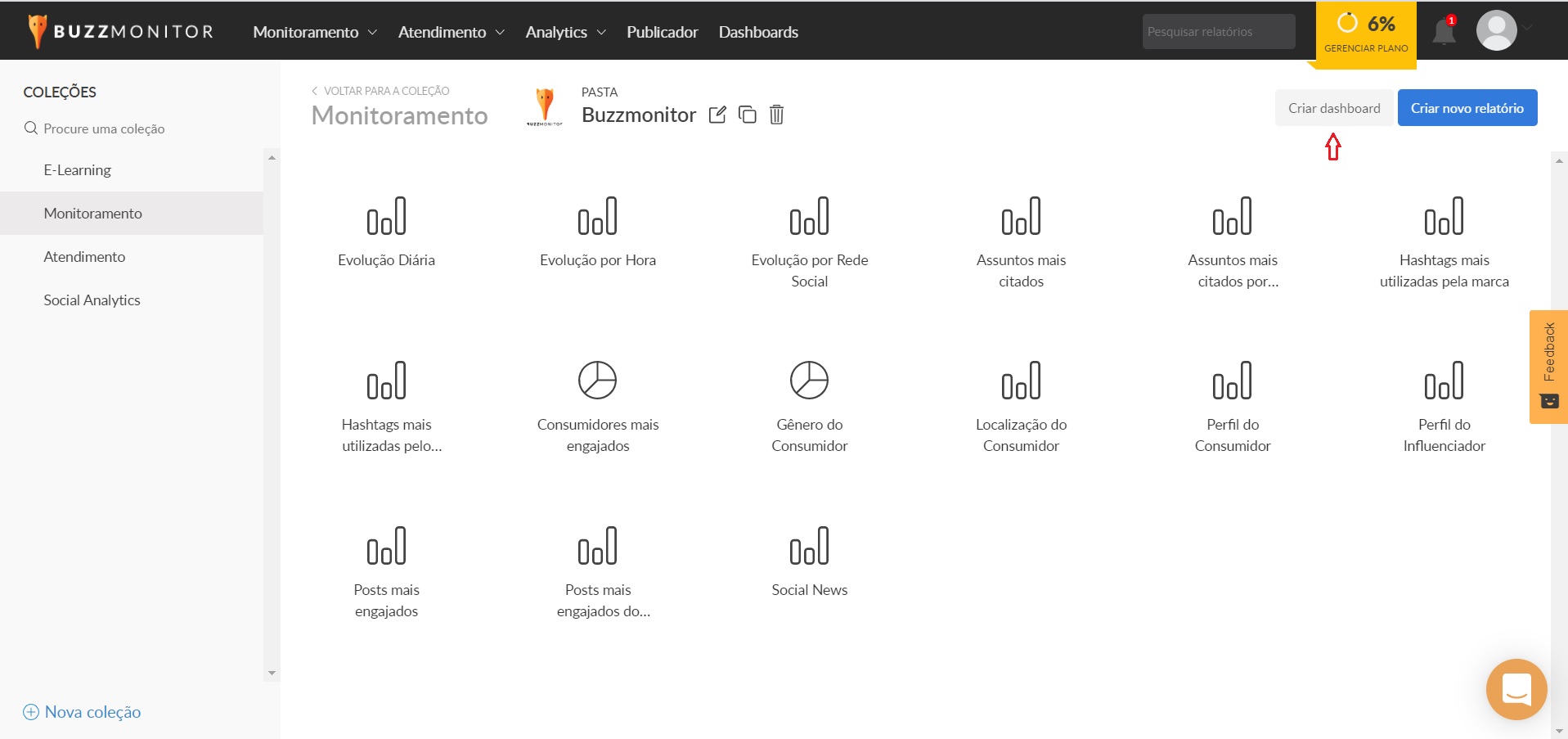 - Em seguida ao abrir a sua pasta de monitoramento basta clicar em Criar Dashboard.